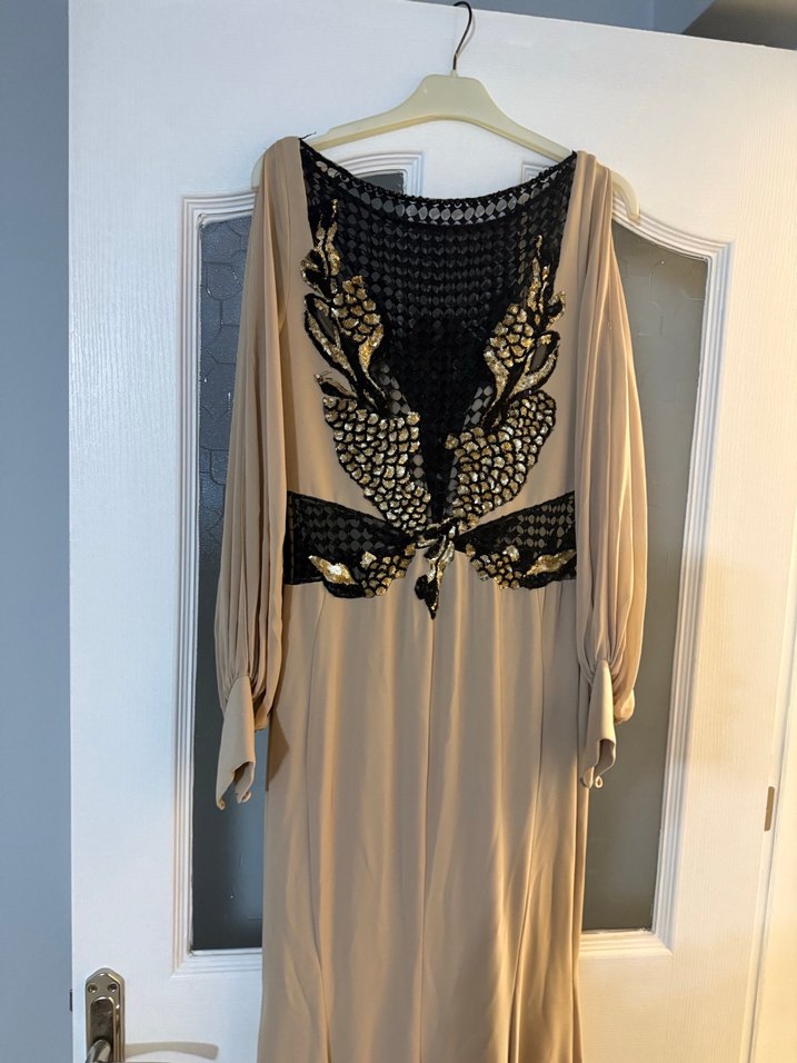 Bej vintage uzun elbise, bol kesim, uzun kollu ve drapeli detaylara sahip. Straplez yaka ve koyu desenlerle düğünler için uygun.