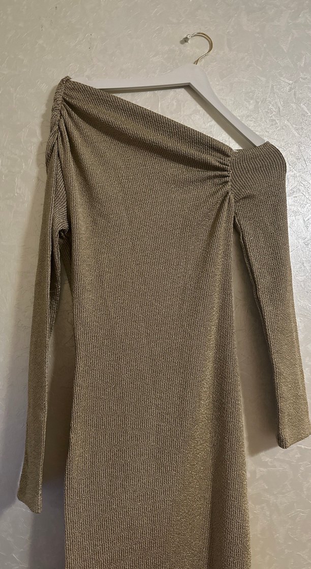 Bej renkte, uzun kollu ve drapeli tasarıma sahip, straplez kesim uzun elbise. Günlük kullanıma uygun, modern ve rahat bir stil sunar.