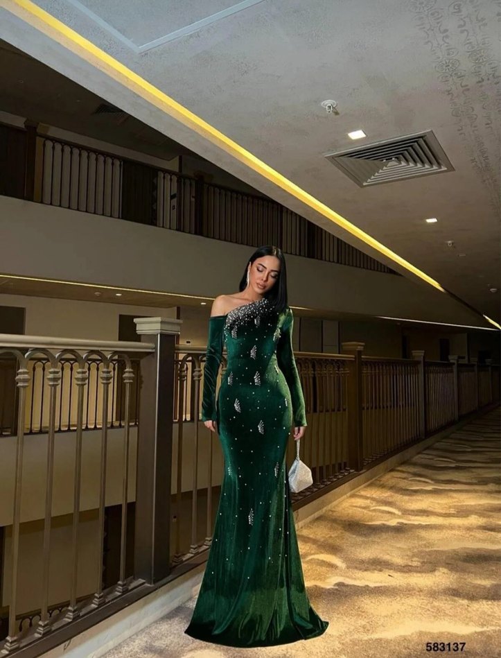 Uzun kollu, drapeli ve straplez kesime sahip bu dar kesim abiye, parlak haki desenli kumaftan olup düğünler için uygundur. ✨
