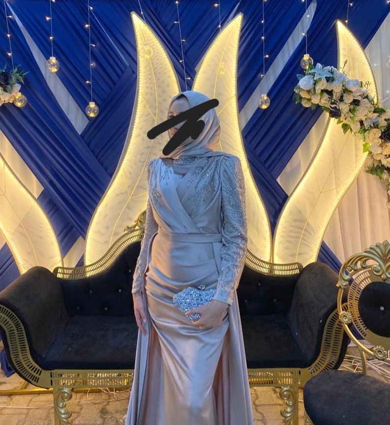 Uzun kollu, yüksek yakalı ve drapeli tasarıma sahip fitted kesim açık gri abiye. Tesettür ve avangart stilde, düğünlere uygun.