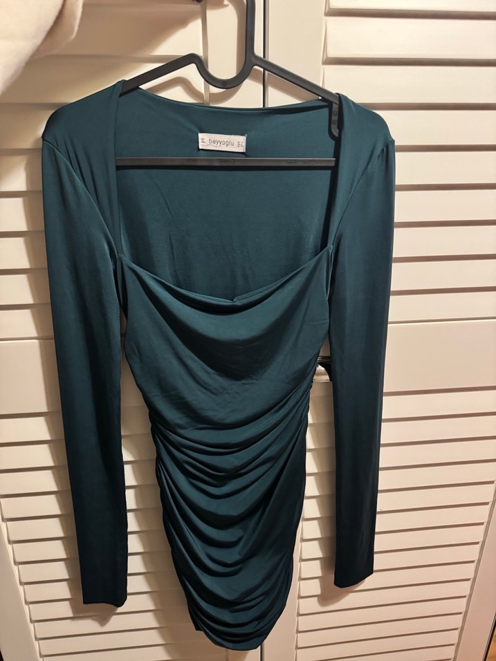 Uzun kollu, drapeli V yakalı, turkuaz renkli elbise. Normal mini boyda, düz ve yumuşak sentetik kumaştan, romantik akşamlar için uygundur. Ürün esnektir.