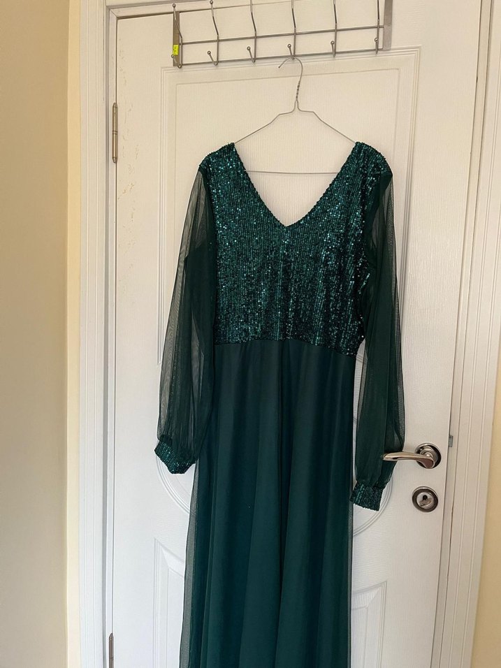 Uzun, yeşil, drapeli V yaka ve uzun tül kollu abiye elbise. Salaş kesimli, bohem ve şık, düğünler için uygun. sadece 1 kez kullanıldı