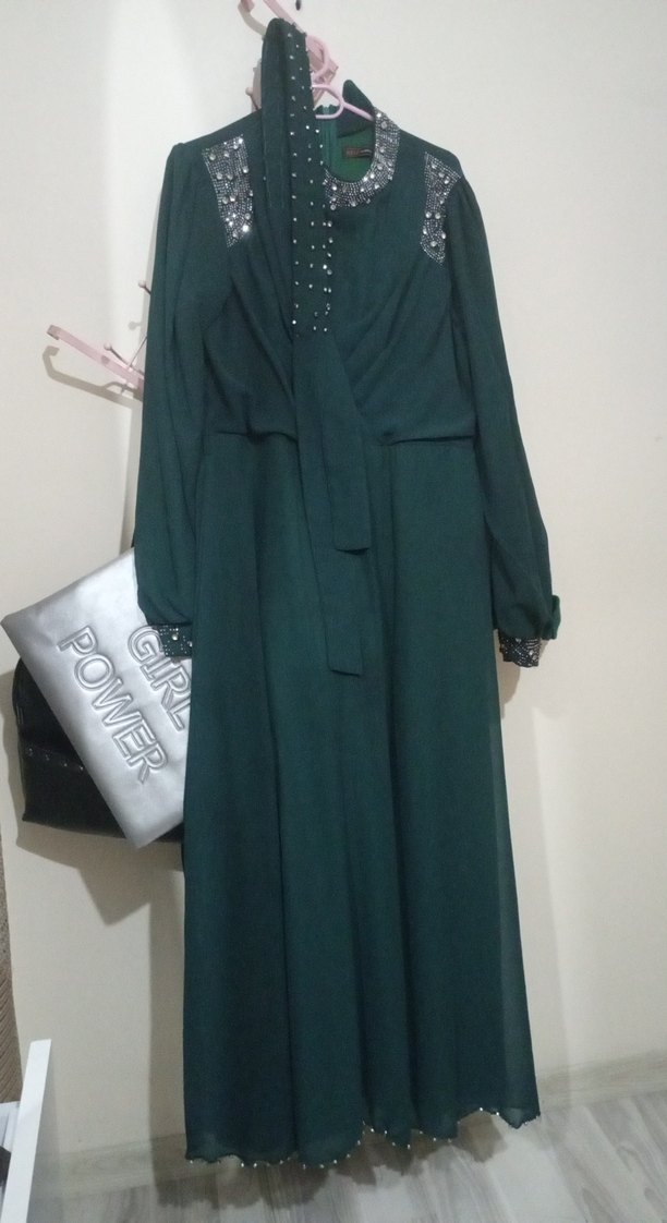 Uzun kollu, bol kesim koyu yeşil abiye elbise, yüksek yakalı ve drapeli detaylara sahip. Omuz ve manşetlerde işlemeli, mütevazı bohem tarzda.