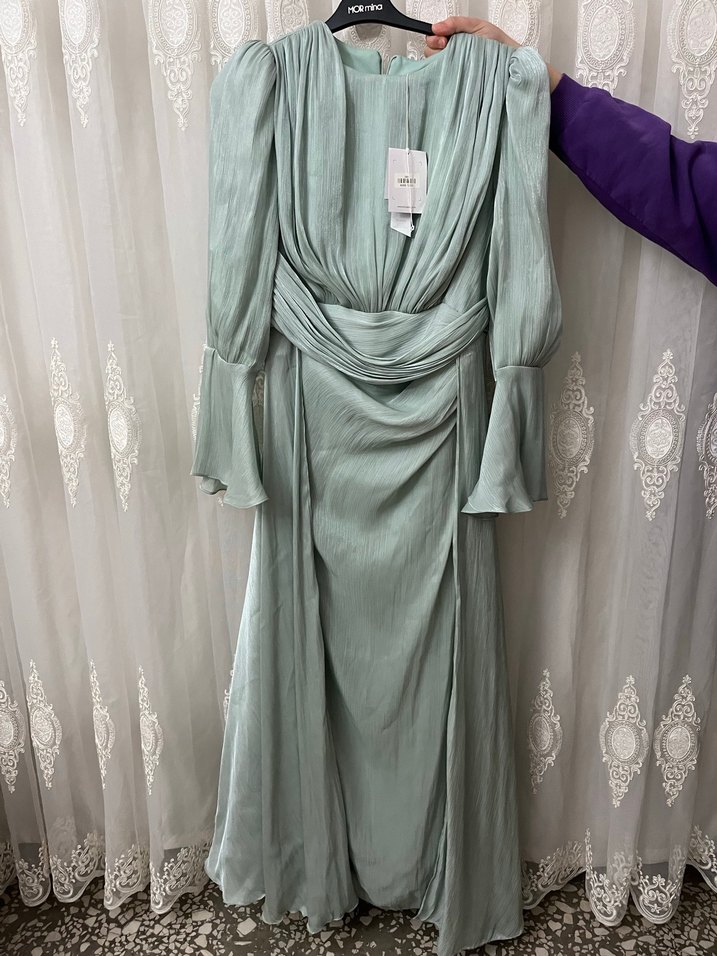 Uzun, bol kesim yeşil abiye elbise, drapeli tasarımı, uzun kollu ve yüksek yakalıdır. Düğünler için uygundur. Hiç giyilmedi.