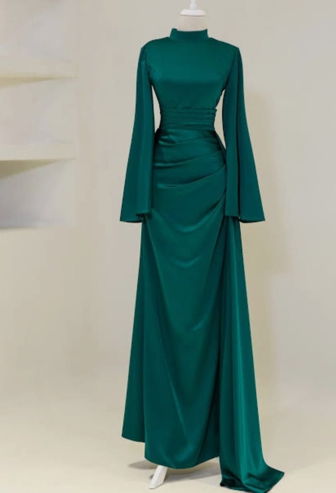 Uzun kollu, yüksek yakalı ve drapeli tasarıma sahip koyu yeşil abiye elbise. Düz kesim ve modern klasik stil, düğünler için uygun.