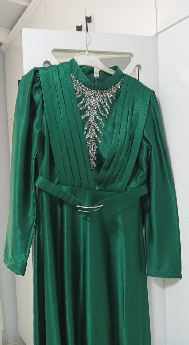 Uzun kollu, drapeli ve V yaka detaylı yeşil abiye elbise. Parlak nakış süslemeleriyle klasik ve modern bir görünüm sunar.