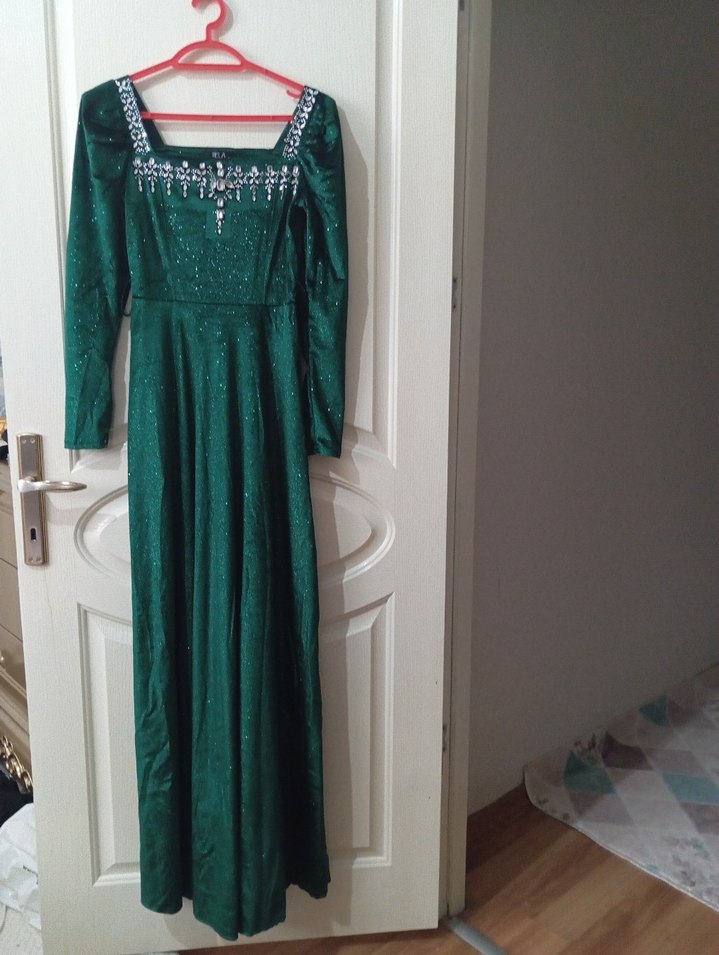 Uzun Kollu, Drapeli Yeşil Abiye Elbise