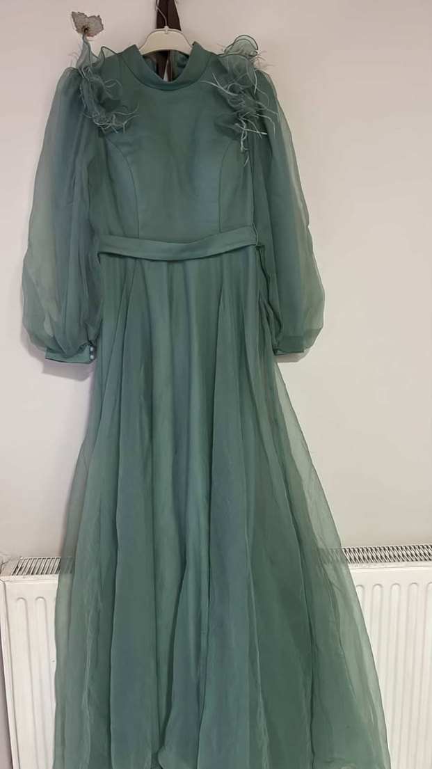 Uzun kollu, drapeli ve bol kesim yeşil abiye elbise. Tekn modern klasik tarzda, tek renk ve tekne yaka detayıyla düğünler için uygundur. Altındaki dikişlerinde biraz sökülme var