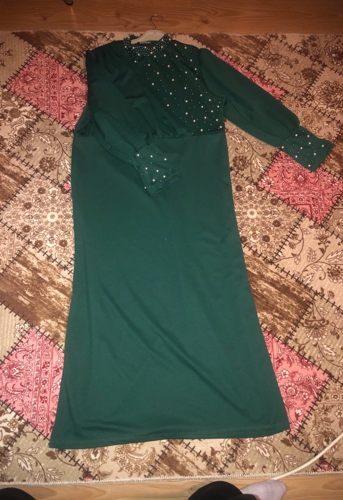 Uzun kollu ve yüksek yakalı bu yeşil elbise, drapeli detaylara sahiptir. Vücuda oturan kesimi ve yumuşak sentetik kumaşı ile mütevazı ve klasik bir tarz sunar. Günlük kullanıma uygundur.