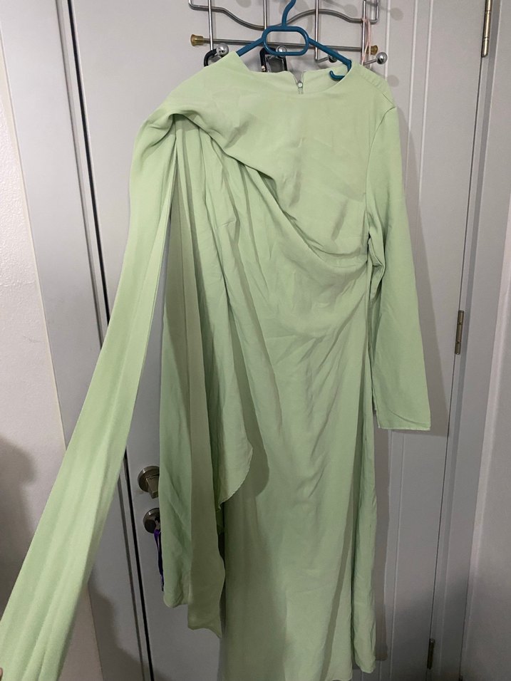 Yüksek yakalı, drapeli ve ince kesimli uzun elbise, pastel yeşil ve ipeksi kumaştan, ofis için uygun modern tarzda.