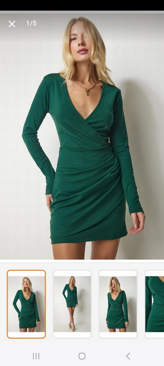 Drapeli detaylı, V yaka, yeşil mini elbise. Uzun kollu, vücuda oturan kesim ve midi boyda, sentetik yumuşak kumaştan yapılmıştır.