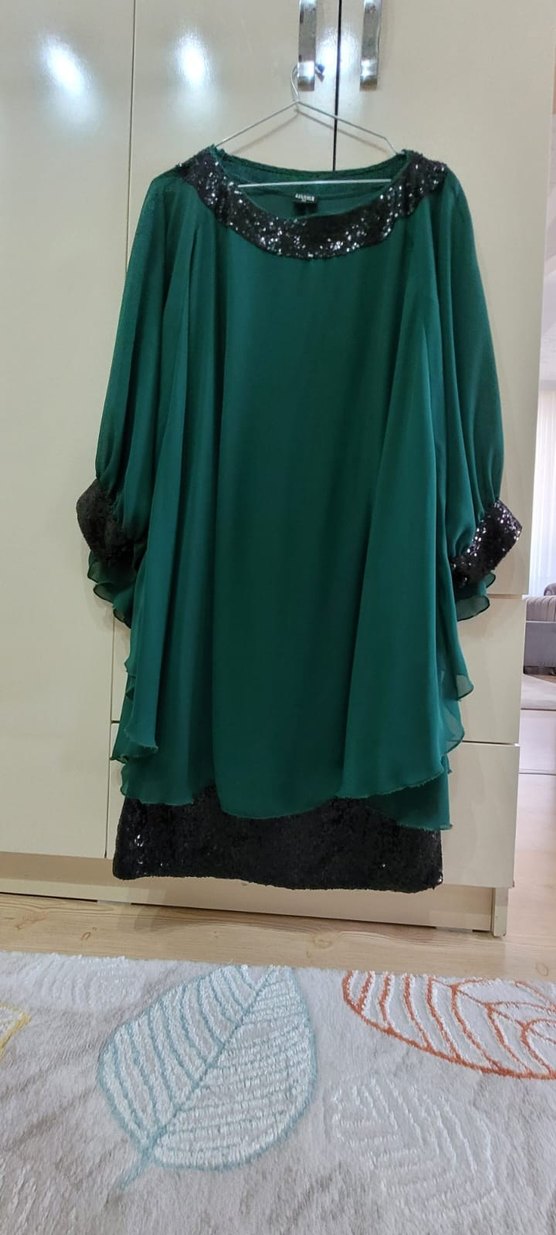 Uzun kollu, drapeli ve straplez yaka detaylı yeşil elbise, rahat kesimi ve gotik-avant-garde tarzıyla mütevazı bir şıklık sunar.