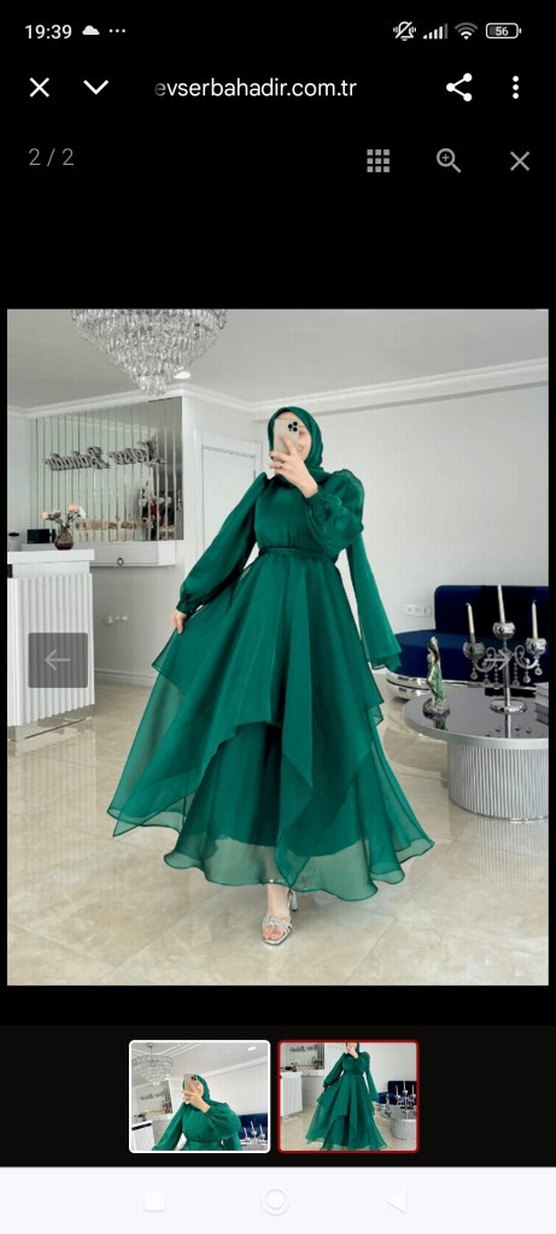 Uzun kollu, yüksek yakalı, drapeli katmanlara sahip salaş yeşil elbise, günlük kullanım için mütevazı ve çağdaş bir stil sunar.