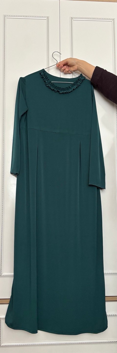 Uzun kollu, koyu yeşil renkte drapeli ve bol kesimli, teknelik yakalı bu elbise, ofis için sade ve mütevazı bir tercih sunar. Sentetik kumaştan üretilmiştir. Anne elbisesi önünde küçük delik var var ama belli olmuyor
