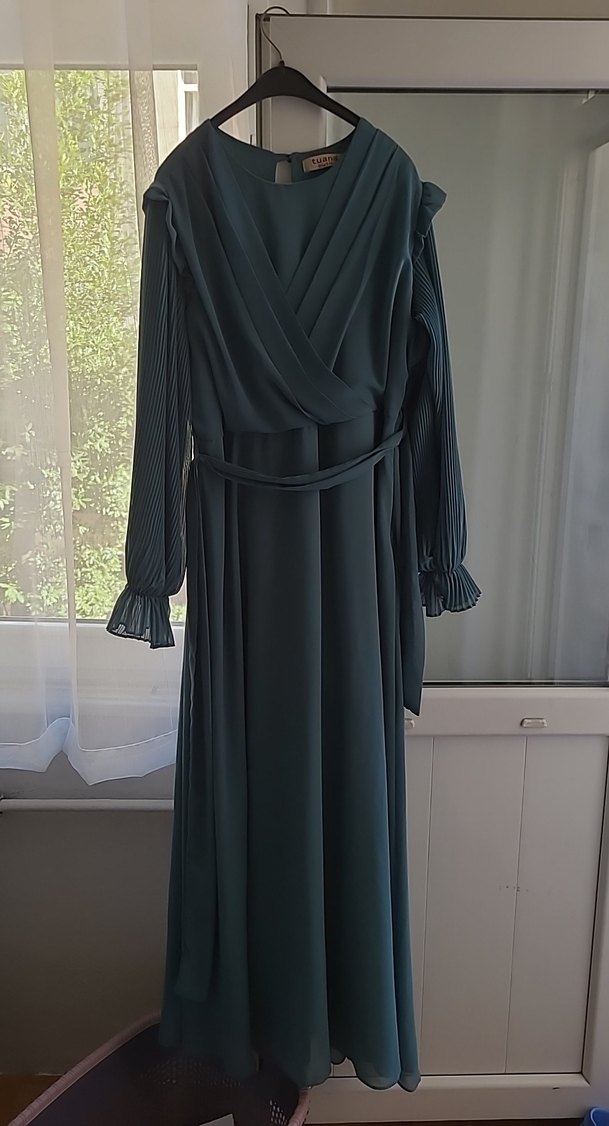 Drapeli V yakalı, uzun kollu koyu yeşil uzun elbise. Bol kesim ve modern klasik tarzda . Yumuşak sentetik kumaştan üretilmiştir.