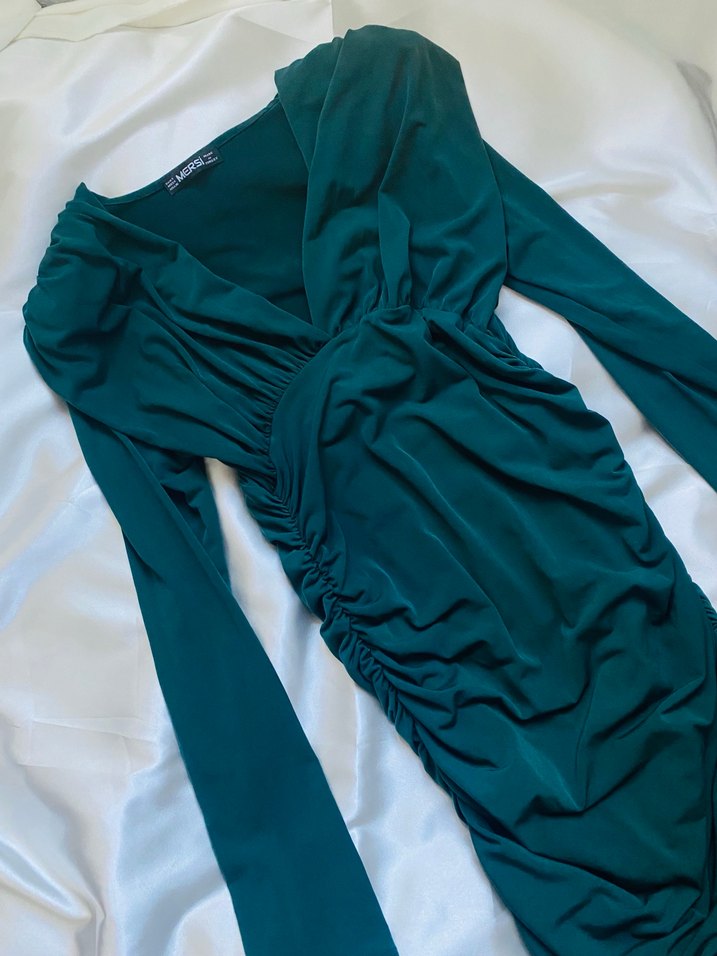 Drapeli detaylı, V yaka ve uzun kollu, yeşil renkte şık ve minimal bir elbise.