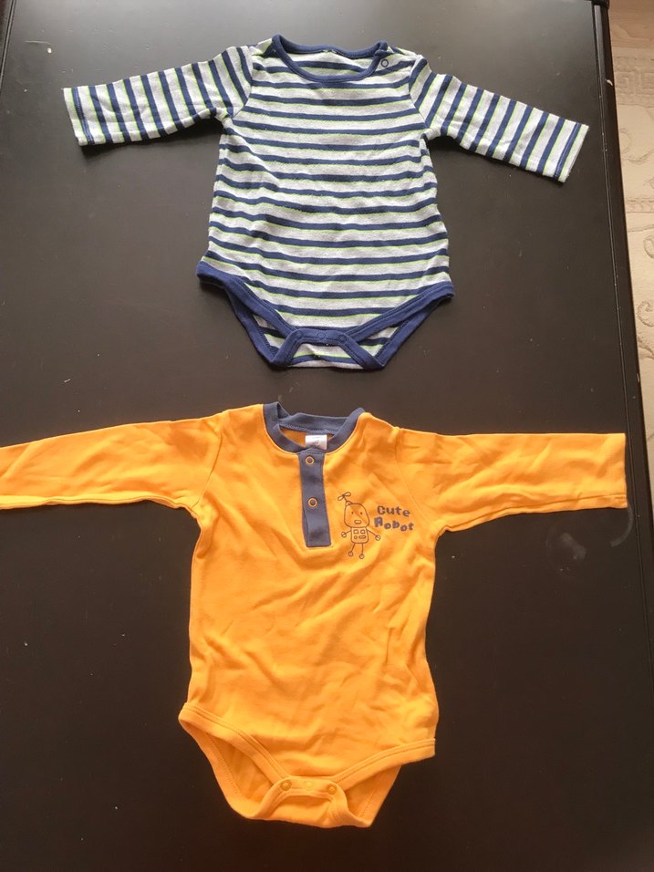 Pamuklu, uzun kollu bebek bodyleri, yuvarlak yaka ve düğmeli. Biri çizgili, diğeri sevimli robot baskılı. 3/6 ay