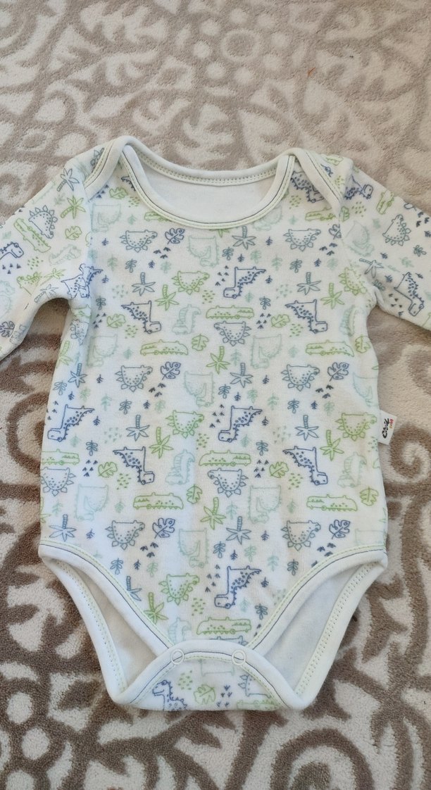Uzun kollu, düğmeli bebek body. Yumuşak sentetik kumaştan, pastel beyaz renkte ve bohem dinozor desenli.