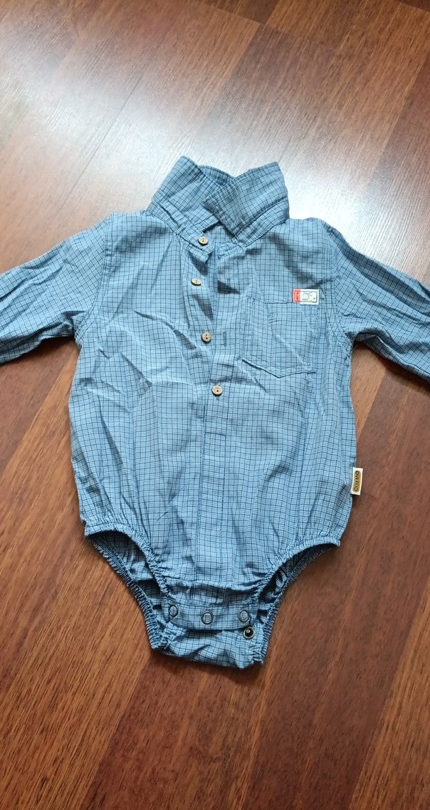 Düğmeli ön, uzun kollu ve yakalı bu bebek body, yumuşak denim kumaştan gri-mavi tonunda üretilmiştir. Streetwear tarzında, alt kısmında kolay değişim için çıtçıtlar bulunur.