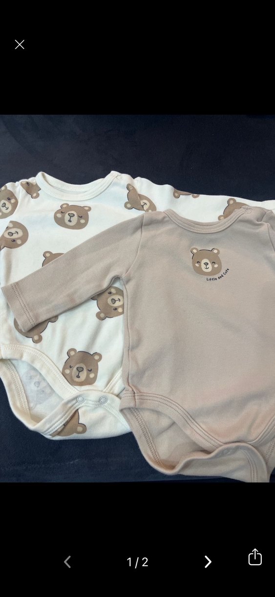 İki adet uzun kollu bebek body seti, düğmeli ve ayı desenli. Yumuşak ve sıcak kumaştan, bej ve krem pastel tonlarda, yuvarlak yaka. Hiç giyilmedi yıkandı kaldırıldı