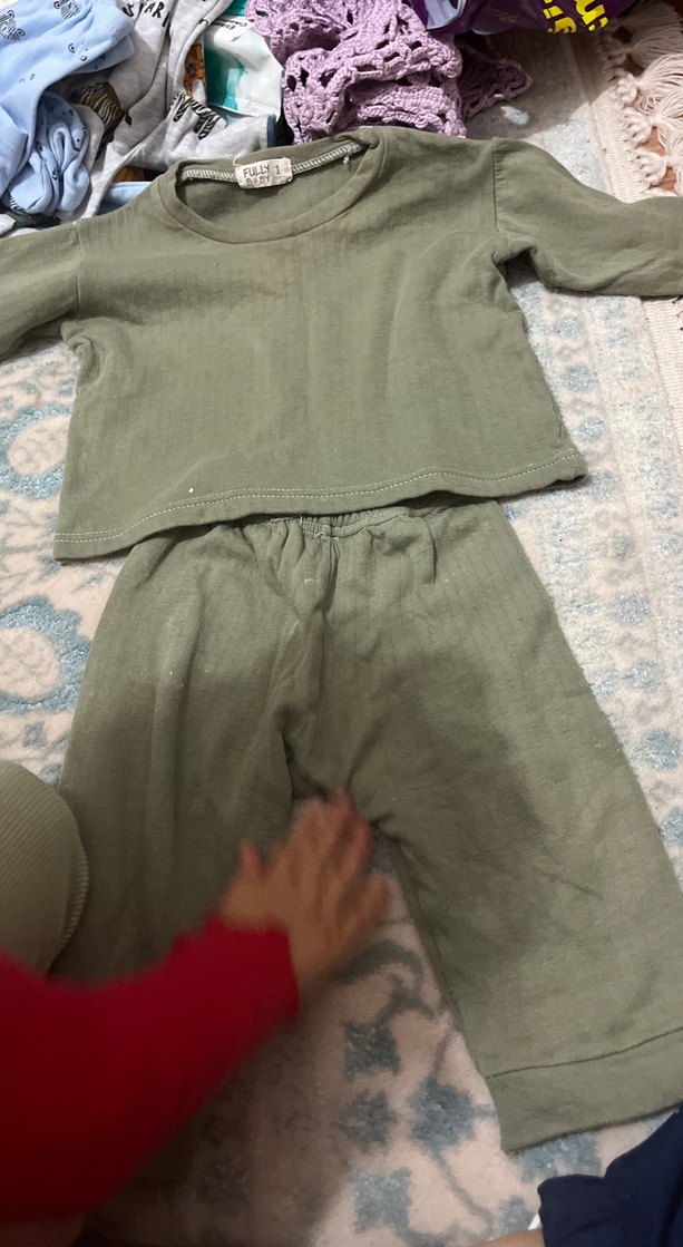 Yumuşak keten kumaştan, düğmeli ve uzun kollu bebek hastane kıyafeti, sade ve normcore tarzda, yeşil tonlarında.