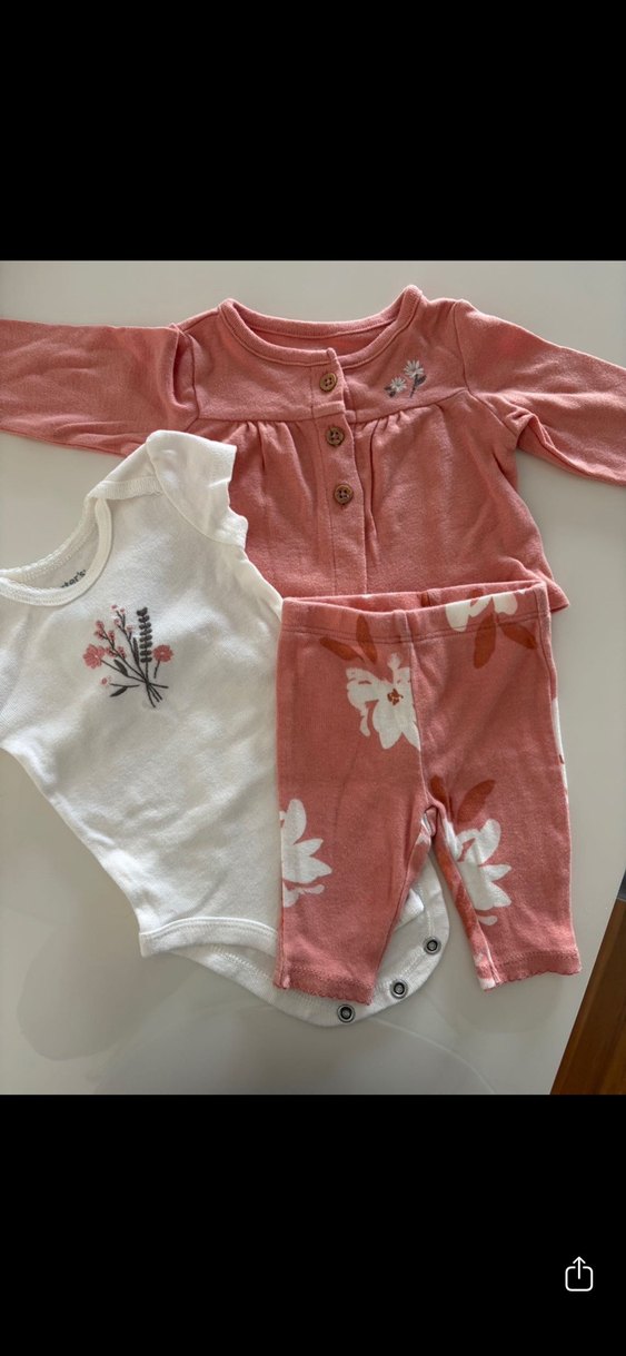 Pastel pembe uzun kollu düğmeli üst, beyaz çiçek desenli pantolon ve küçük çiçek baskılı beyaz bebek kız takımı.
