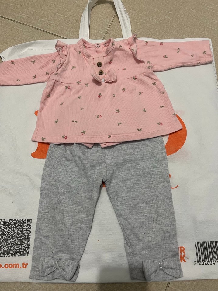 Uzun kollu, düğmeli pembe üstü desenli, gri yumuşak kumaşlı, paçalarında küçük fiyonk detaylı bebek kız takımı.
