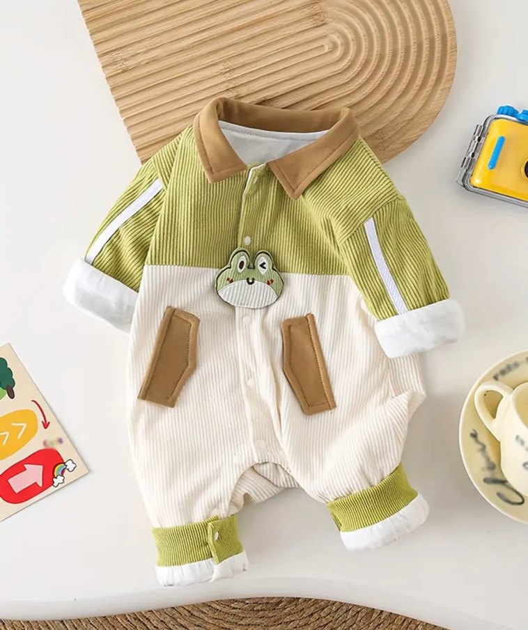 Uzun kollu, düğmeli ve yakalı bebek tulumu, yumuşak kumaştan, pastel renkler. 6-9 ay boyutunda. Hiç kullanılmadı.