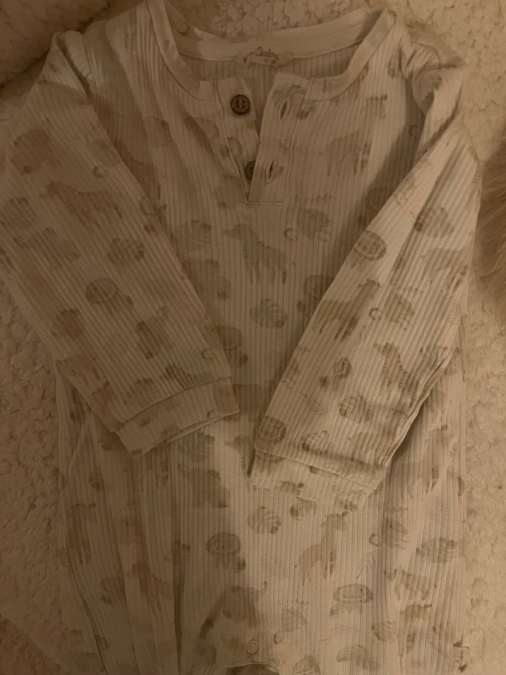 12-18 ay.Yumuşak keten kumaştan yapılmış bej uzun kollu bebek tulumu. Düğmeli ön ve bohem tarzda çentikli yaka bulunur.