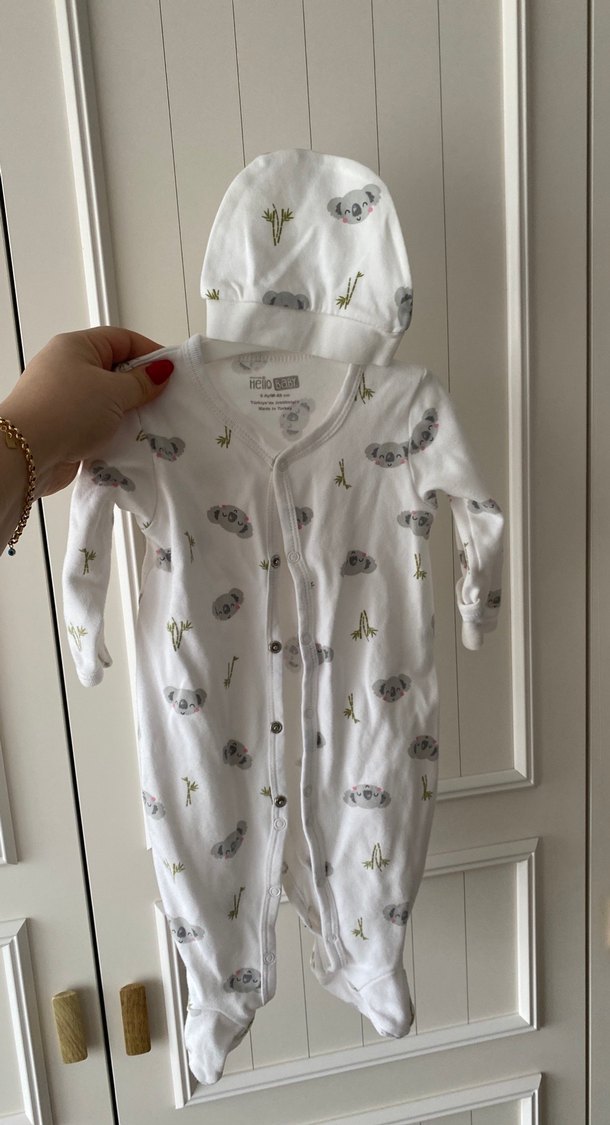 Pamuklu, beyaz renkli uzun kollu bebek tulumu, düğmeli ve yuvarlak yakalıdır. Gri koala ve bambu desenleriyle sokak stilini yansıtır.
