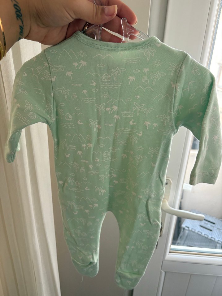 Pastel yeşil renkte, uzun kollu, yuvarlak yakalı ve düğmeli bebek tulumu. Pamuklu yumuşak kumaştan, rahat ve sokak stili uyumlu.