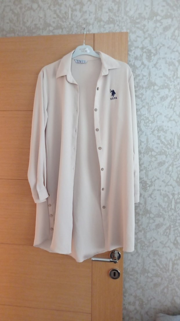 Uzun kollu, düğmeli ve yakalı bej uzun tunik gömlektir. yumuşak esnek kumaş Günlük rahat tarz için uygundur.