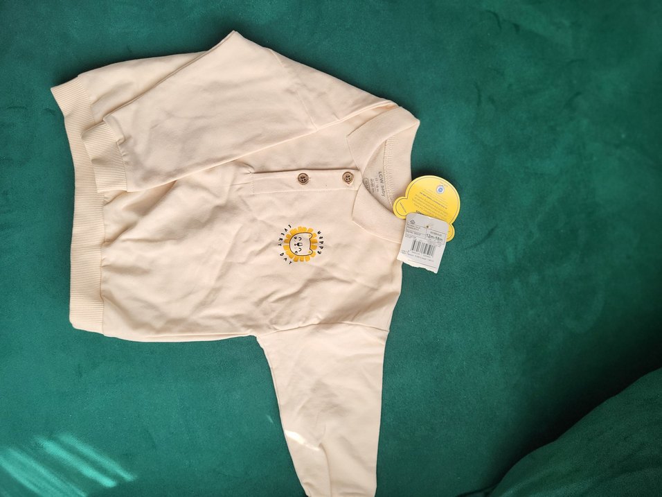 Uzun kollu, düğmeli beyaz bebek body. Yumuşak ve sıcak kumaş, baskılı sevimli aslan deseniyle sokak tarzı için uygun.