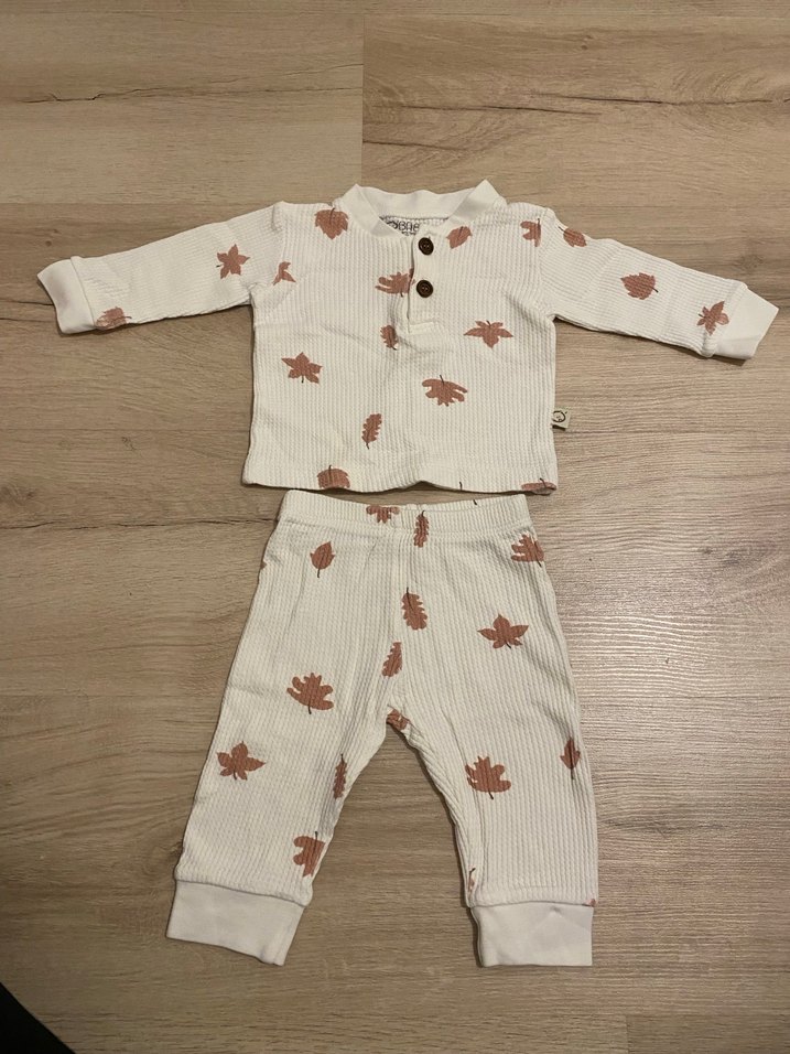 Uzun kollu, düğmeli beyaz üst ve yaprak desenli eşofman altından oluşan yumuşak bebek takımı. Bir kez giyildi tertemiz 3-6 ay