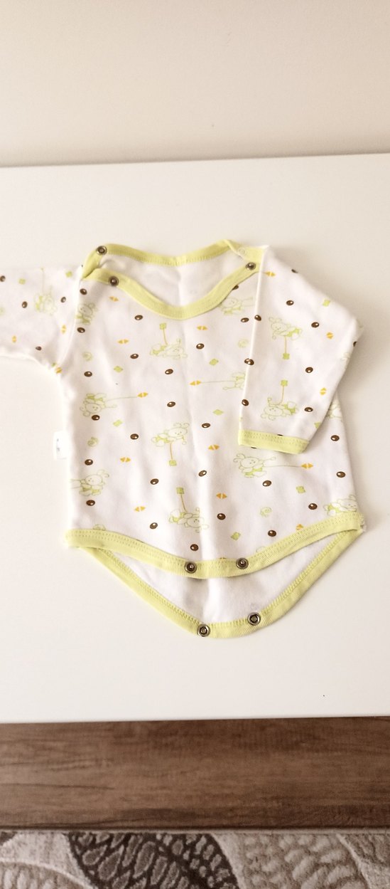 Beyaz zemin üzerine renkli desenler bulunan, uzun kollu ve düğmeli bebek kız bodysi. Yuvarlak yakalıdır.
