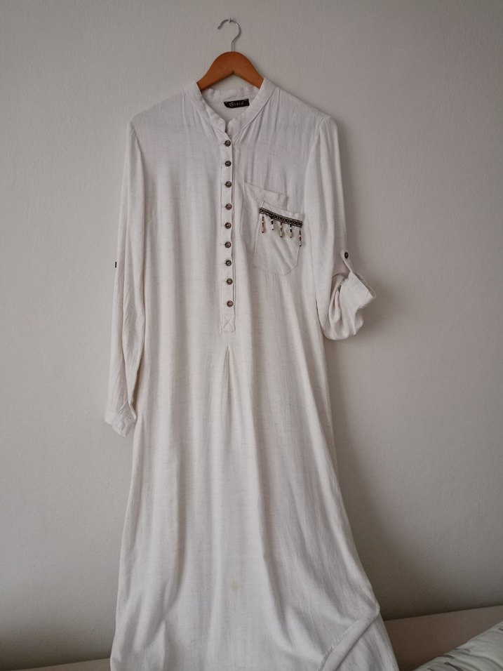 Uzun Kollu Düğmeli Bohem Beyaz Elbise