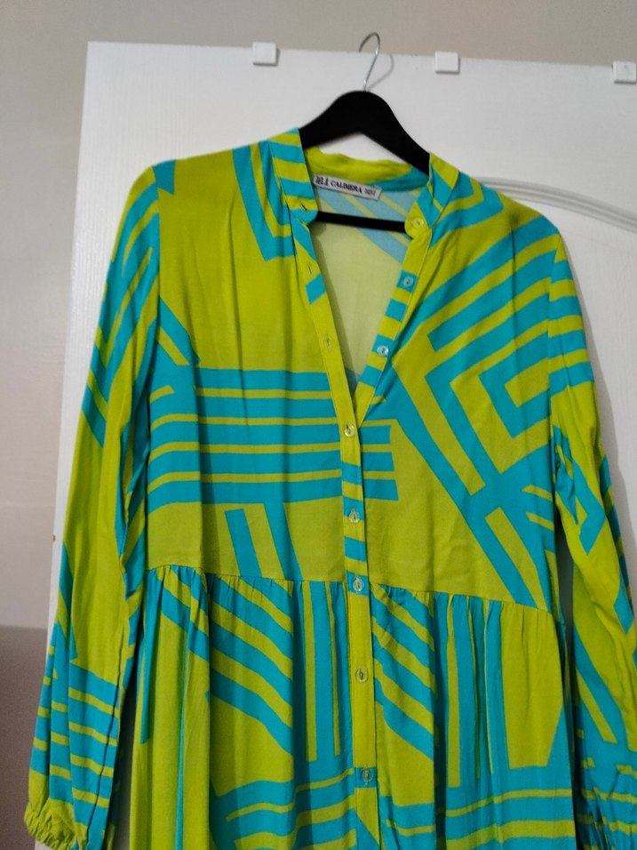 Uzun kollu, düğmeli ve V yakalı bu elbise bol kesimdir. Hafif çok renkli tie-dye deseniyle bohem tarzındadır ve yumuşak sentetik kumaştan üretilmiştir. Günlük kullanıma uygundur.