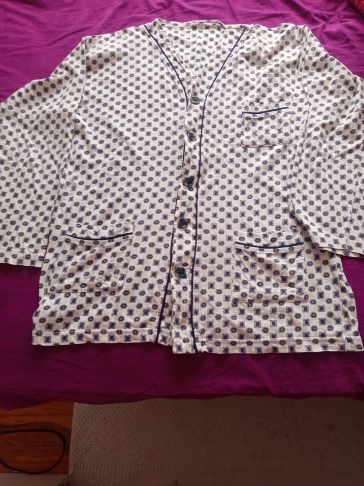 Erkek pijama üstü, uzun kollu ve düğmeli olup bol kesimdir. Beyaz ve lacivert desenli, bohem tarzda, yakası çentikli ve midi boyda, üç ceplidir.