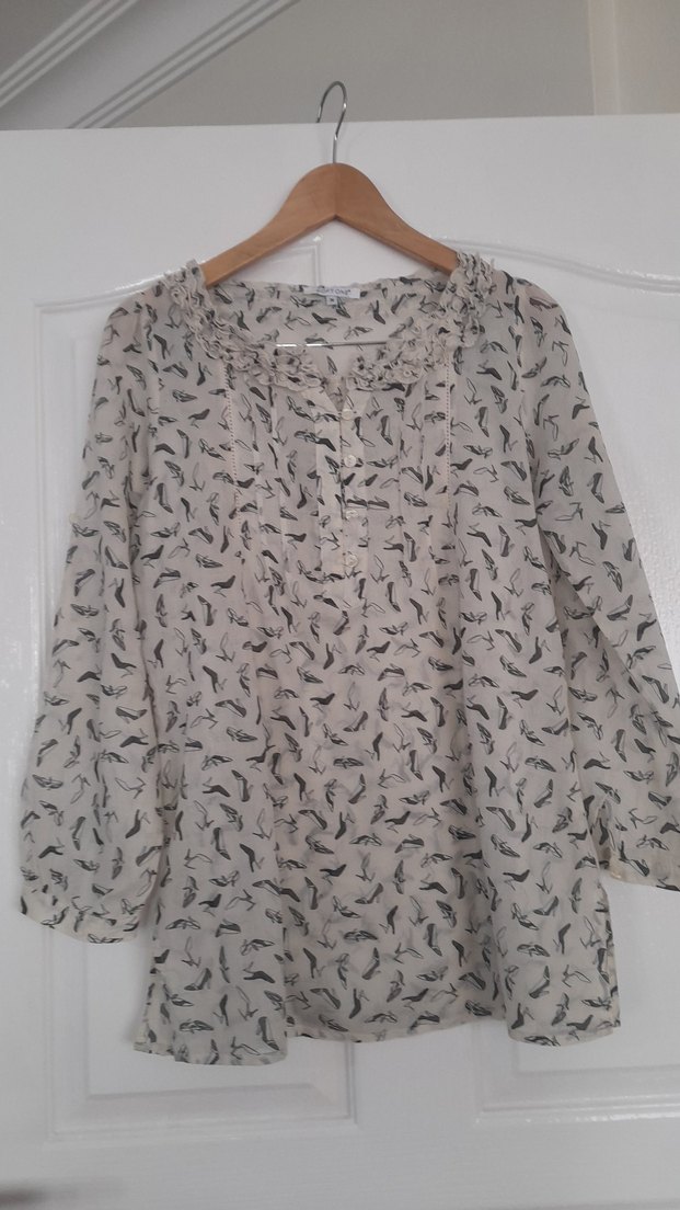 Bej renkte, uzun kollu, düğmeli ve yuvarlak yaka bohem kadın bluz. Rahat kesimi ve yumuşak keten kumaşıyla günlük kullanım için uygundur.