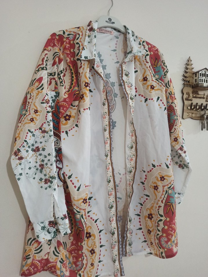 Uzun kollu, düğmeli, bol kesim bohem kadın gömleği. Çok renkli desenli ve notalı yaka detayına sahiptir.