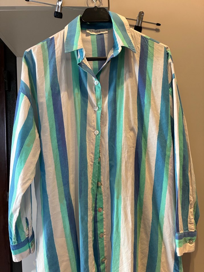 Bol kesim, uzun boylu gömlek düğmeli ön ve yakalı kesime sahiptir. Yumuşak keten kumaştan yapılmış, pastel tonlarda çizgili desene sahiptir.