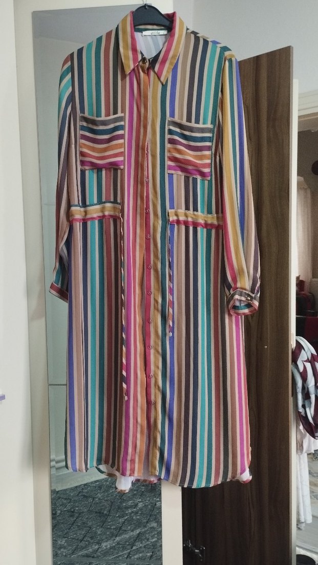 Bu uzun boy kadın tunik, tekne yaka ve düğmeli ön tasarıma sahiptir. Bol kesim, pastel çok renkli dikey çizgilerle sentetik kumaştan yapılmıştır. Uzun kollu ve ön cep detaylı bohem tarzı bir parçadır. 1.2 defa giyilmiş