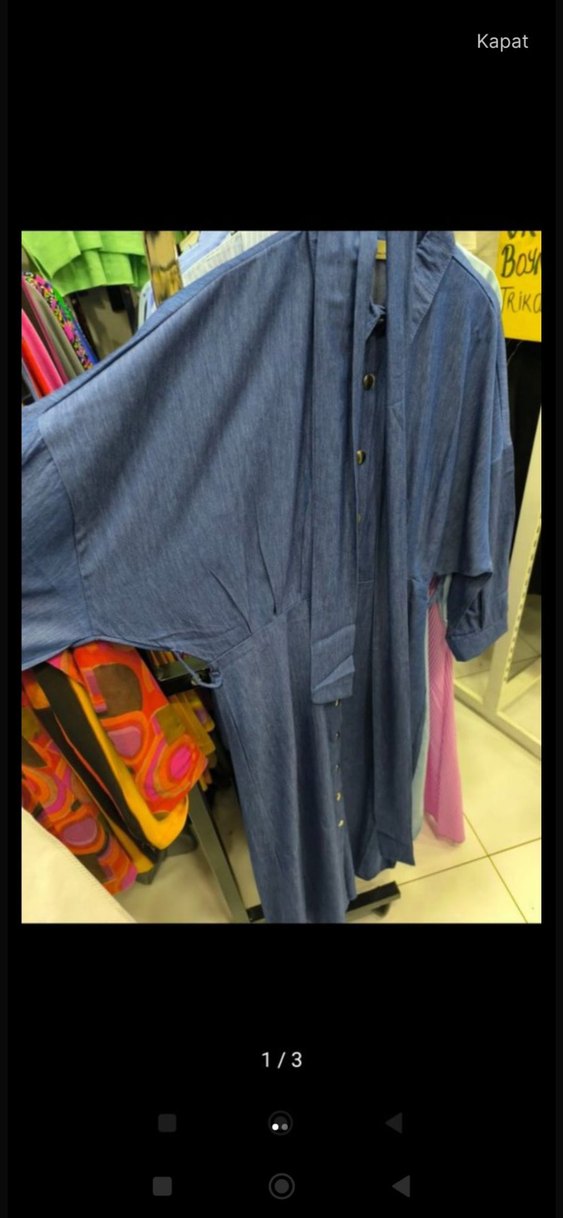 Kadınlar için bol kesim, uzun kollu, düğmeli denim elbise. Notlu yakası ve hafif batik deseni vardır. Günlük kullanıma uygundur. Marka: TRIK.