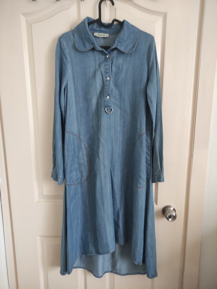 Uzun boylu, düğmeli ön ve yakalı uzun kollu mavi denim tunik. Rahat kesimi ve günlük normcore tarzıyla dikkat çeker.
