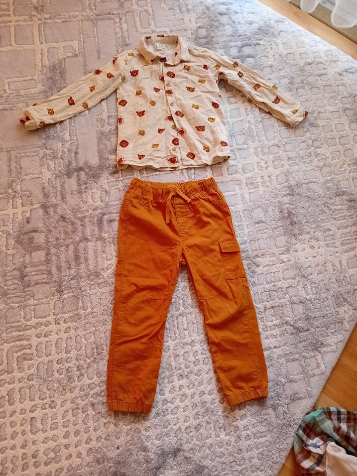 Pamuk kumaştan yapılmış, uzun kollu, düğmeli açık kahverengi gömlek ve düz turuncu pantolondan oluşan erkek bebek takımı.