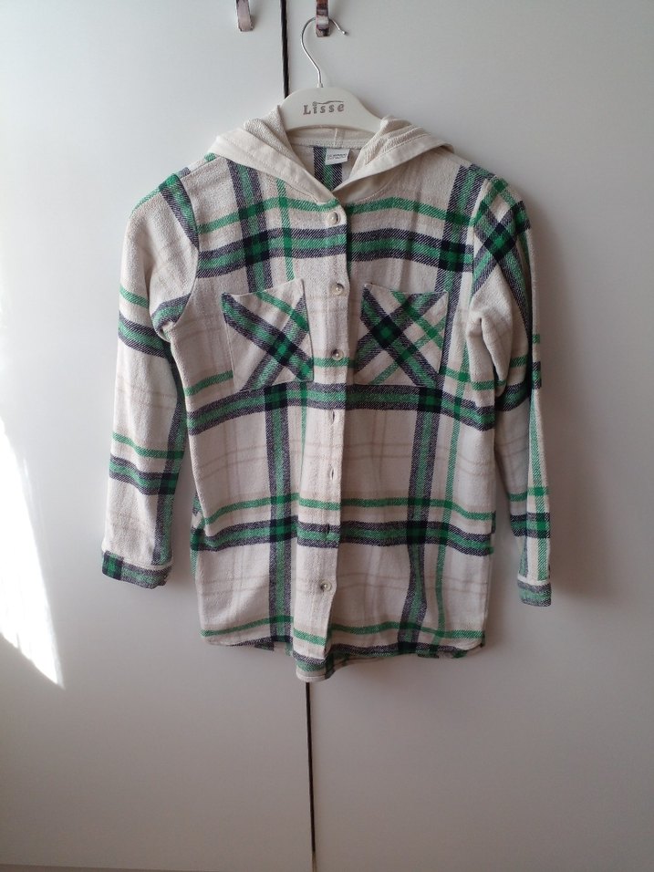 Yumuşak ve sıcak kumaştan, düğmeli, uzun kollu, geniş kesim ve normal uzunlukta, yeşil ekoseli beyaz tonlarında rahat sokak stili gömlek.