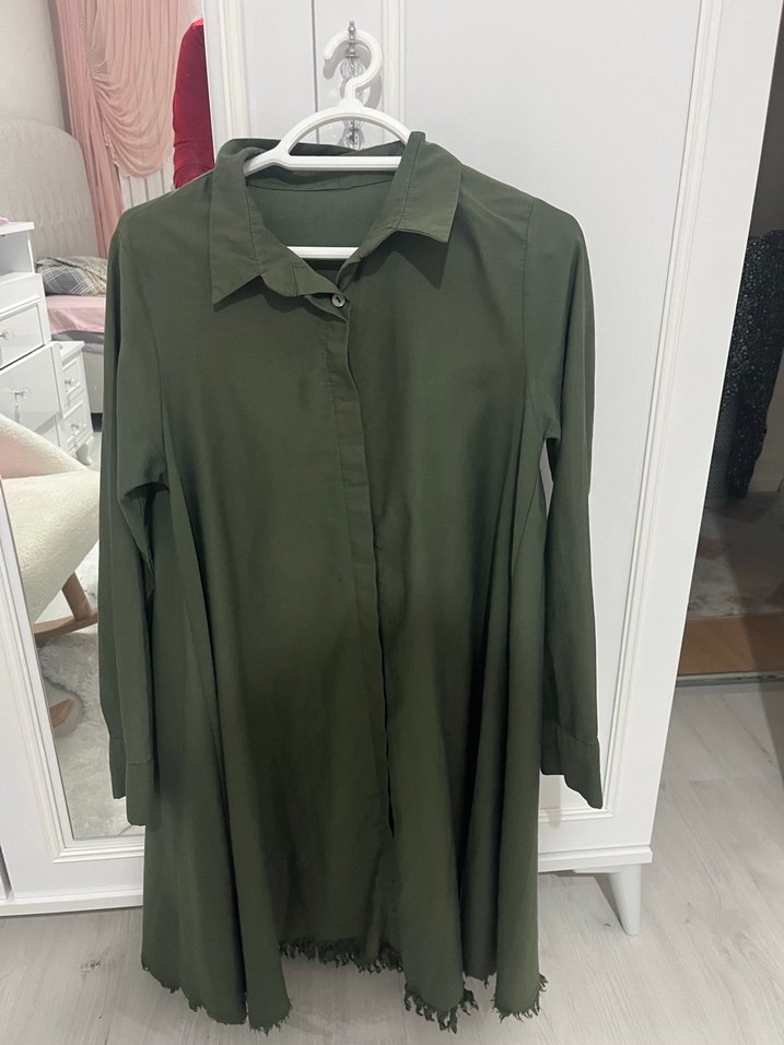 Uzun Kollu, Düğmeli Haki Kadın Gömlek tunik