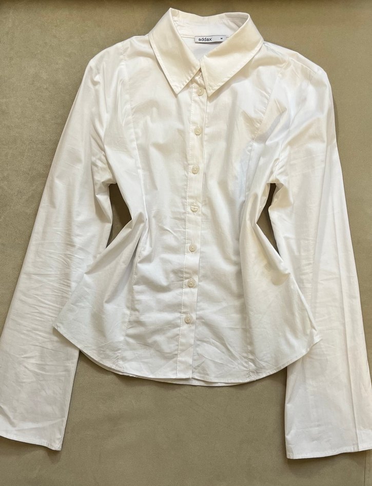 Düğmeli, yakalı ve uzun kollu beyaz gömlek. Normal midi boyda, vücuda oturan kesimiyle günlük veya resmi bir şekilde kombinlenebilir. Sade ve şık bir parça.(Sadece bir kez giyildi.)