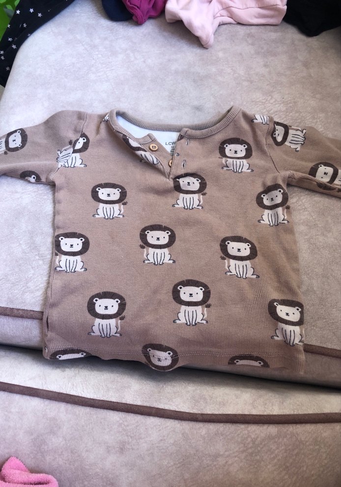 Bu kahverengi bebek body, yuvarlak yaka ve uzun kolludur. Yumuşak, sıcak kumaştan üretilmiş, aslan desenli ve düğmeli detaylara sahiptir.