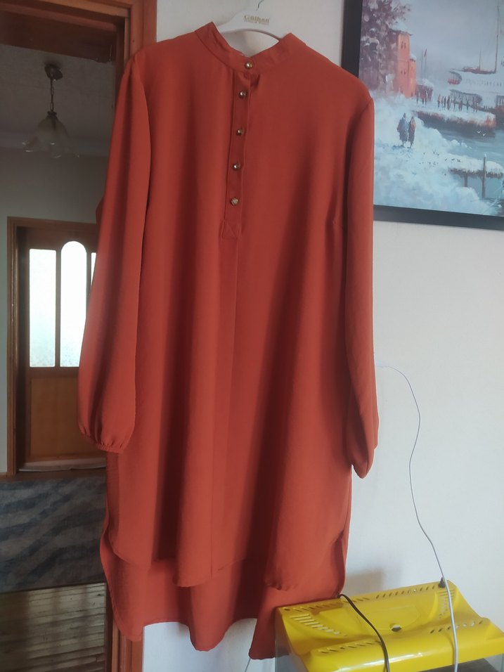 Uzun kollu, düğmeli ve bol kesim kahverengi tunik, ipeksi kumaştan yapılmıştır. Günlük kullanıma uygundur. ✨